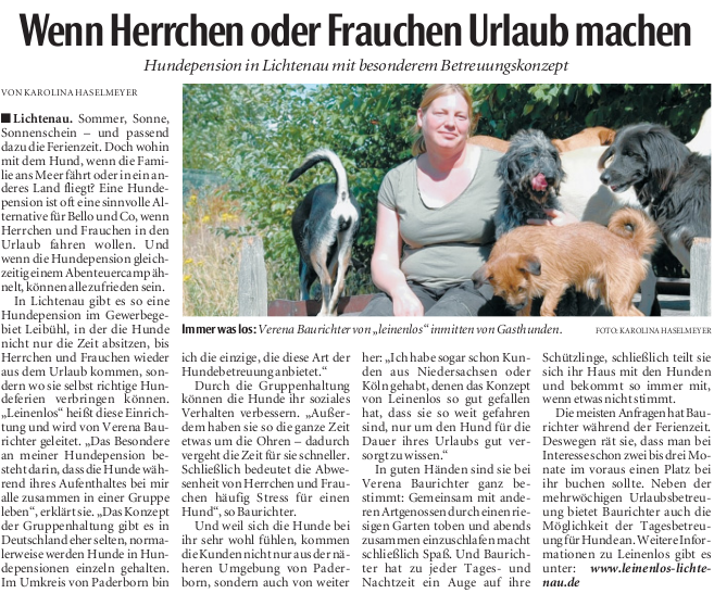 Wenn Herrchen oder Frauchen Urlaub machen (Quelle: Neue Westfälische, Nr. 176, 31. Juli / 1. August 2010, Karolina Haselmayer)